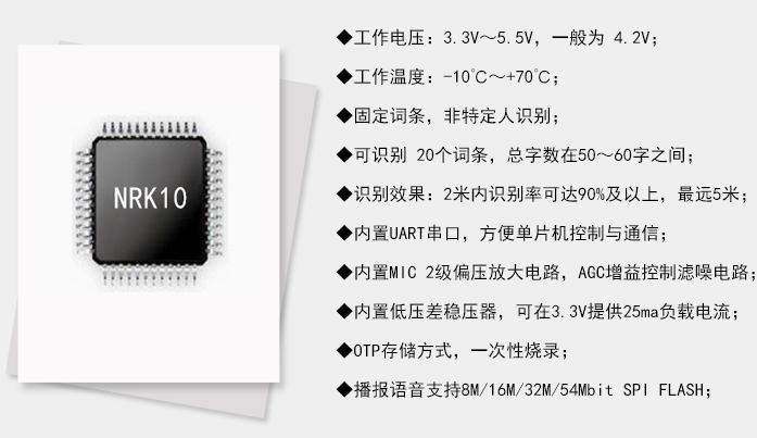 在此背景之下,九芯電子推出NRK10語音識別芯片,無須外圍元件,直接對接外部,集成了一顆高性能、低成本的離線語音識別芯片,具有語音識別及播報功能,需要外掛 SPI-Flash,存儲詞條或者語音播內容。他具有識別率高,工業級性能、簡單易用,更新詞條方便等優勢。廣泛應用在智能家居、AI人工智能、玩具等多種領域。